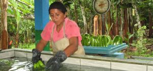 Nach jeweils einer Woche Feldarbeit kommt der Erntetag. Eva wäscht und wiegt die Bananen ab, Yony packt sie in Kartons. Die gesamte Farm wird im Agroforstsystem bewirtschaftet.
