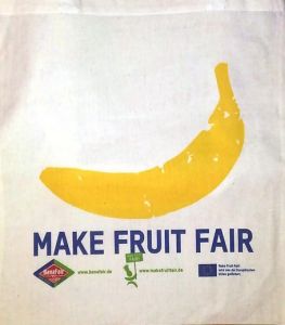 Die neuen Stoff-Schultertaschen mit dem Schriftzug der Make Fruit Fair-Kampagne sind ein echter Hingucker. Und natürlich aus Fairem Handel. Sowohl die Baumwolle als auch die Druckfarben sind GOTS-zertifiziert. Die Taschen sind 38 x 42 cm groß und haben lange Henkel. Die Make Fruit Fair-Tasche kostet 3,50 € (zuzügl. Versand / Wiederverkäufer erhalten Rabatt).